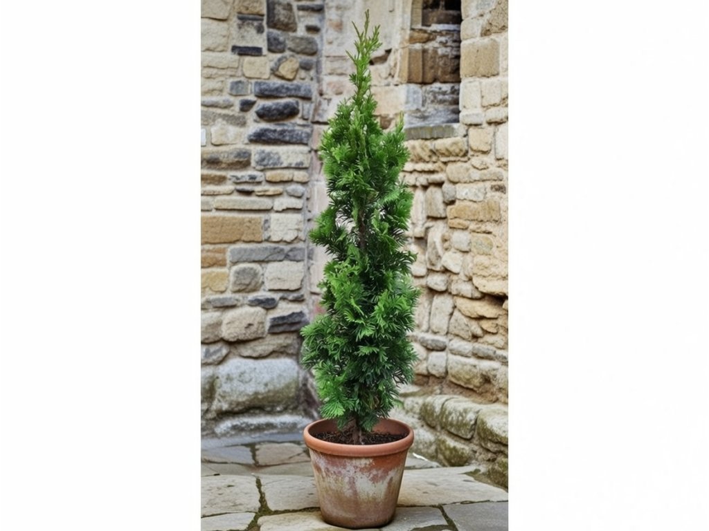 Kužeľovitý úzky tvar, vetvičky sú krátke, tmavo - zelené.